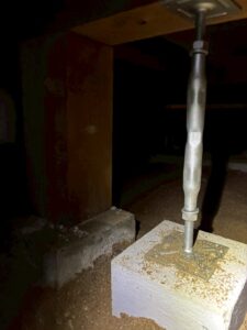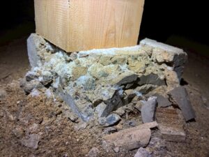 点検の結果、玄関框にはシロアリの食害が確認され、さらに床下にはナメクジやキノコが繁殖するほどの湿気がこもっていました。束石や束柱の劣化も著しく、複数の劣化・被害が同時に進行していた状況でした。
