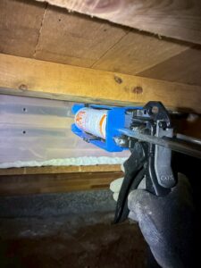 写真は散布ですが、これとは別に、木材内部に棲みついたシロアリにまで行き渡らせるため、注入も行います。