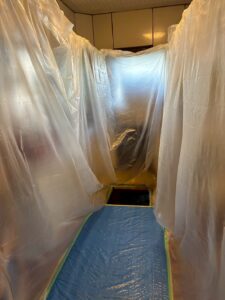 お家に上がらせていただき、周辺部に傷をつけたり塵が付着しないよう、念入りに養生致します。