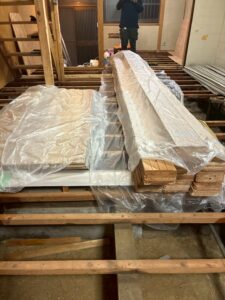床下に入る前に、地上にある家具や木材などをビニールで保護する、養生を行います。