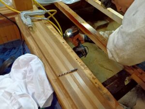 木材に小さな穴を開けて、薬剤を直接注入する穿孔処理を施しました。