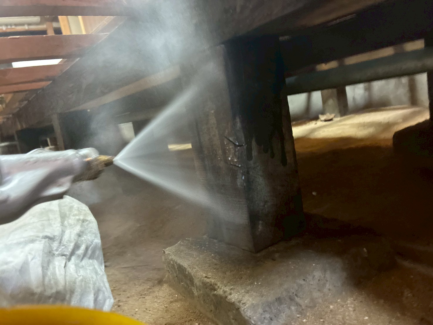 今回は、木部に穴をあけて薬剤を注入する「穿孔処理」と、床下全体への「薬剤散布(タケロック使用)」を組み合わせることで、ピンポイントの駆除と広範囲への再発防止を両立させるご提案を行いました。