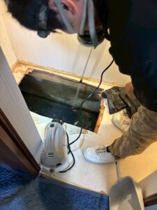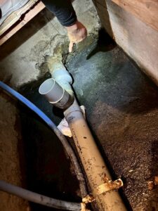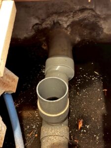 床下を捲ると、トイレの排水管が抜けていたことが判明しました。