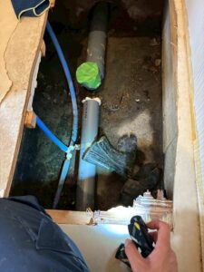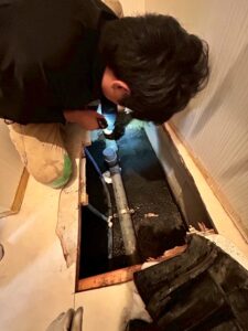 「コバエが家の中で大量に発生している」とのことで現地調査を行ったところ、床下には湿気や異臭、さらにはコバエの卵まで確認されました。さらに詳しく点検を進めたところ、トイレの排水配管が経年劣化や過去の詰まり対応などの影響により抜けてしまっていたことが発覚。