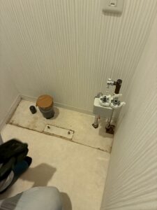 トイレの取り外しを行い、床材も一旦捲らせていただきます。