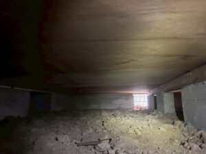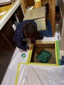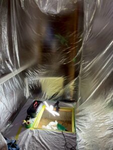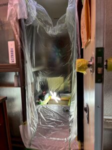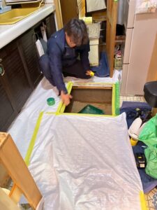 床下からは砂埃やカビが舞い上がるため、徹底的に養生して作業を進めます。