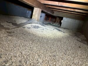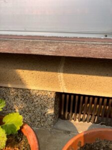 調査の結果、シロアリの発生を確認。さらに床下では、束石の中性化による劣化や、古い銅管からの水漏れも見つかりました。束石はひび割れが進み、強度が低下している状態で、このまま放置すると地震時の倒壊リスクも懸念される状況でした。