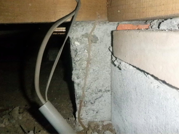 床下の柱は床下の環境が湿気を保持しやすく、蟻道が作られやすい場所です。床下の換気が不十分であったり、雨水がはいってしまったりした場合に湿度が高くなります。